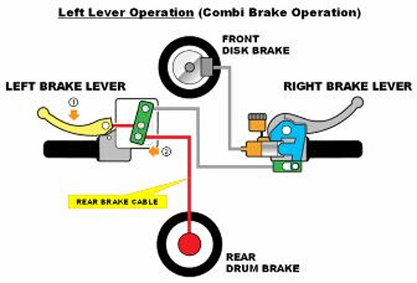 Jika dilihat secara detail, pada tuas rem kiri atau rem belakang terdapat equalizer bercabang dua. Satu kabel mengarah langsung ke rem belakang dan satu kabel lainnya ke kabel konektor tadi.